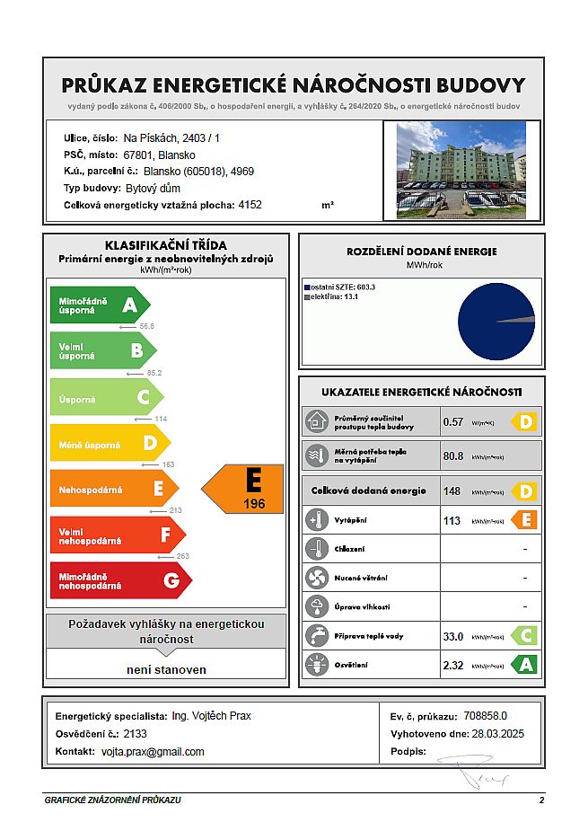 Nachází se v 5. NP moderního cihlového domu s výtahem, který prošel nedávnou renovací, včetně nové plechové střechy, očištěním fasády, nového protiplíňového nátěru a byly instalovány i nové okapy.